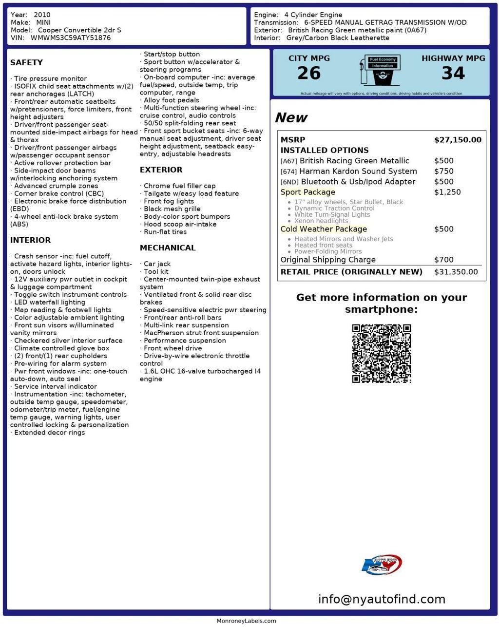 Take a look at this British Racing Green Metallic 2010 MINI Cooper S Convertible with Grey/Carbon Black Leatherette Interior and only 65,969 miles. This is one sharp looking car with eye catching wheels and sporty, fun looks. It also has great options and very desirable, super low mileage. A car that is this clean, sporty and well preserved is a gift to find. It comes equipped with a 1.6L 4-cylinder Engine paired to a 6-speed Manual Transmission, Sport Package (with 17 Black Star Bullet Alloy Wheels, Dynamic Traction Control, White Turn Signal Lights, Xenon Headlights), Cold Weather Package (with Heated Front Seats, Heated Mirrors and Washer Jets, Power-Folding Mirrors), Bluetooth and USB, Harman Kardon Sound System, Cruise Control, Steering Wheel Controls, AM/FM Radio, Power Windows, Power Locks, Air Conditioning and so much more. Every NY Auto Find vehicle comes with a complimentary Limited Warranty and a Carfax Vehicle Report. Our vehicles are priced to sell quickly. Please call to check availability and schedule an appointment. -