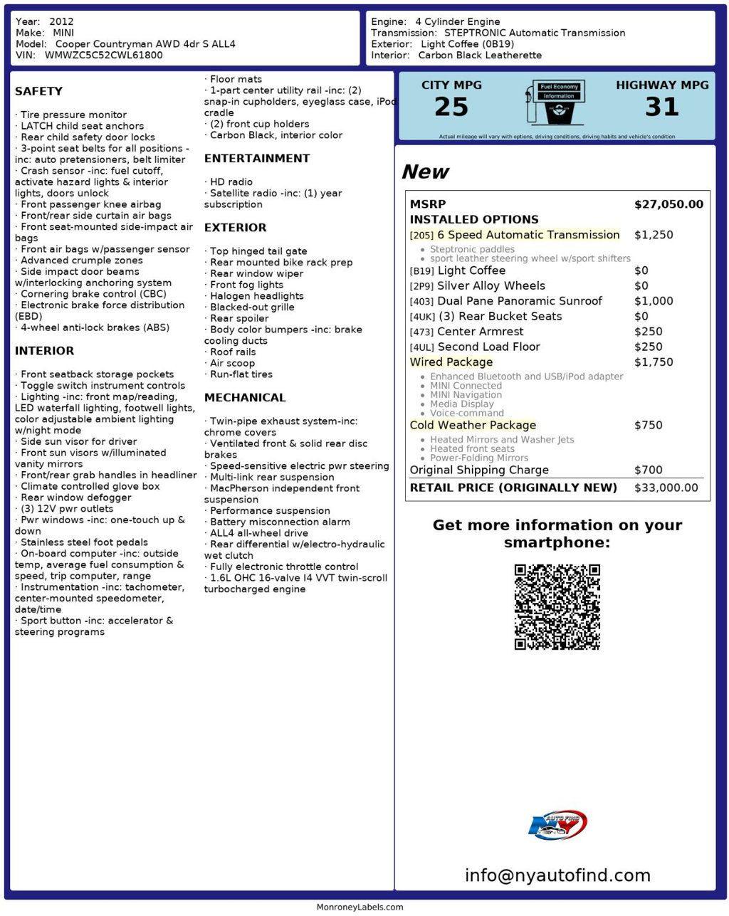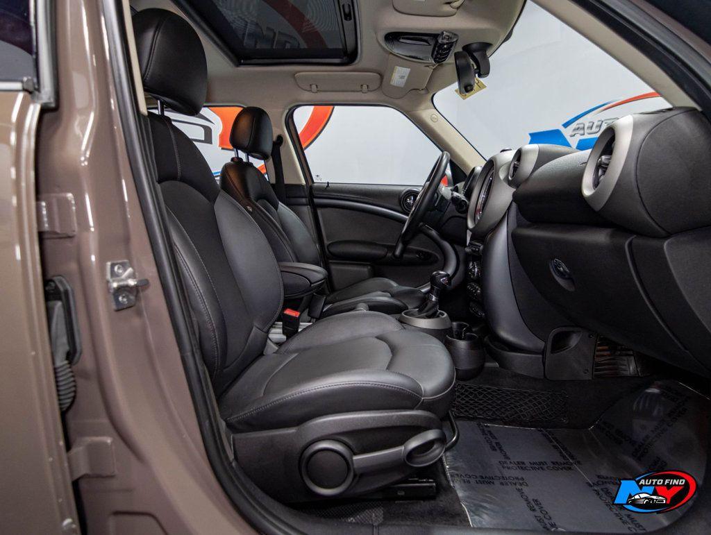 Take a look at this Light Coffee 2012 MINI Cooper S Countryman ALL4 with Carbon Black Leatherette Interior and only 49,836 miles. If you are looking for an exceptionally classy and clean vehicle, then look no further. This is the gem that you were looking for because this car was super well maintained and has the incredibly low mileage to prove just how sparingly it was used. It even has amazing options, making this an all around phenomenal car. It comes equipped with a 1.6L 4-cylinder Engine paired to a 6-speed Automatic Transmission, All Wheel Drive, Dual Pane Panoramic Sunroof, Wired Package (with MINI Navigation, MINI Connected, Media Display, Voice-Command, Enhanced Bluetooth and USB), Cold Weather Package (with Heated Front Seats, Heated Mirrors and Washer Jets, Power-Folding Mirrors), Sport Leather Steering Wheel, Silver Alloy Wheels, 3 Rear Bucket Seats, Second Load Floor, Center Armrest, Cruise Control, Steering Wheel Controls, AM/FM/HD Radio, Power Windows, Power Locks, Air Conditioning and so much more. Every NY Auto Find vehicle comes with a complimentary Limited Warranty and a Carfax Vehicle Report. Our vehicles are priced to sell quickly. Please call to check availability and to schedule an appointment. -
