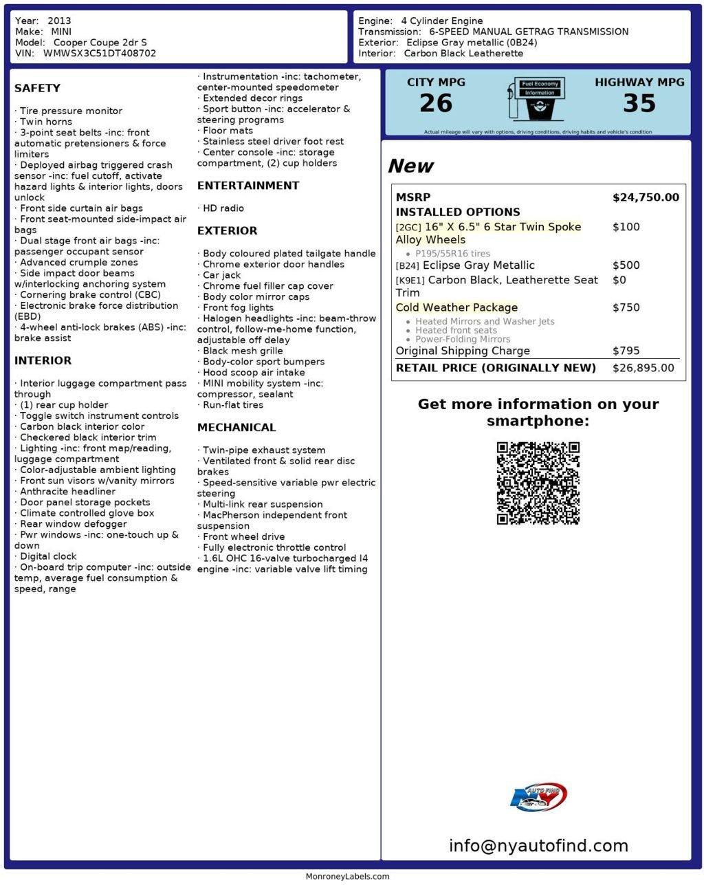 Take a look at this Eclipse Gray Metallic 2013 MINI Cooper S with Carbon Black Leatherette Interior, a Clean Carfax and only 55,970 miles. This car is a shiny beacon of hope for all cars. It has a super clean history, surfaces that are simply gorgeous and mileage that is super low. It is one of those unbeatable cars that you will wish you bought if you miss out on this incredible opportunity so call us now. It comes equipped with a 1.6L 4-cylinder Engine paired to a 6-speed Manual Transmission, Cold Weather Package (with Heated Front Seats, Heated Mirrors and Washer Jets, Power Folding Mirrors), 16 Victory 6-Star Twin Spoke Alloy Wheels, Hood Scoop Air Intake, Black Mesh Grille, Cruise Control, Steering Wheel Controls, AM/FM/HD Radio, Power Windows, Power Locks, Air Conditioning and so much more. Every NY Auto Find vehicle comes with a complimentary Limited Warranty and a Carfax Vehicle Report. Our vehicles are priced to sell quickly. Please call to check availability and schedule an appointment. -