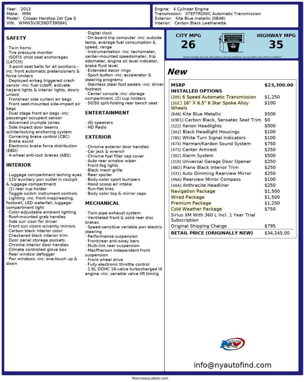 Take a look at this Kite Blue Metallic 2013 MINI Cooper S Hardtop with Carbon Black Leatherette Interior, a Clean Carfax and only 48,375 miles. If you do not love this car, there very well may be something wrong with you because this car has everything to love. From the first look, you can see that this is a stunning vehicle both inside and out with its eye catching color and extraordinary well maintained surfaces. It also has a super clean history and such super low mileage that it would make anyone drool. It even has an absolute boatload of options, making this one jaw dropping find, so do not miss this incredible opportunity. It comes equipped with a 1.6L 4-cylinder Engine paired to a 6-speed Automatic Transmission, Premium Package (with Dual Pane Panoramic Sunroof, Dual Zone Automatic Climate Control, Rain Sensor and Automatic Headlights), Navigation Package (with MINI Navigation, Real Time Traffic Information, Smartphone Integration), Wired Package (with MINI Connected, Enhanced Bluetooth and USB, Media Display, Voice-Command), Cold Weather Package (with Heated Front Seats, Heated Mirrors and Washer Jets, Power-Folding Mirrors), 16 6-Star Spoke Alloy Wheels, Xenon Headlights, Black Headlight Housings, White Turn Signal Indicators, Harman Kardon Sound System, Alarm System, Universal Garage Door Opener, Piano Black Interior Trim, Auto-Dimming Rearview Mirror, Rearview Compass, Anthracite Headliner, Center Armrest, Cruise Control, Steering Wheel Controls, AM/FM/HD Radio, Power Windows, Power Locks, Air Conditioning and so much more. Every NY Auto Find vehicle comes with a complimentary Limited Warranty and a Carfax Vehicle Report. Our vehicles are priced to sell quickly. Please call to check availability and to schedule an appointment. -