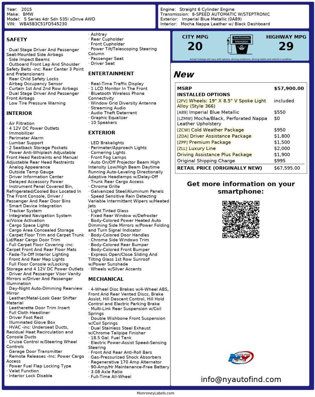 Take a look at this Imperial Blue Metallic 2015 BMW 535i xDrive AWD with Mocha Nappa Leather Interior with Black Dashboard and only 103,804 miles. This car brings a level of class and luxury that is simply breathtaking. It has gorgeous surfaces and a super clean, impressive interior. It also has a ton of valuable optional packages and low mileage, making this an unforgettable find in many ways. It comes equipped with a 3.0L 6-cylinder Engine paired to an 8-speed Automatic Transmission, Sunroof, Navigation, Luxury Line (with 19 V Spoke Light Alloy Wheels, Anthracite Wood Trim), Driving Assistance Plus Package (with Active Blind Spot Detection, Active Driving Assistant, Side and Top View Cameras, Speed Limit Info), Driver Assistance Package (with Rear View Camera, Head-Up Display, Park Distance Control, Instrument Cluster with Extended Contents), Premium Package (with Power Tailgate, Comfort Access Keyless Entry, Satellite Radio), Cold Weather Package (with Heated Front Seats, Heated Rear Seats, Heated Steering Wheel, Retractable Headlight Washers), Nappa Leather Upholstery, Bluetooth Wireless Phone Connectivity, LED Brakelights, Cruise Control, Steering Wheel Controls, AM/FM Radio, Power Windows, Power Locks, Air Conditioning and so much more. Every NY Auto Find vehicle comes with a complimentary Limited Warranty and a Carfax Vehicle Report. Our vehicles are priced to sell quickly. Please call to check availability and schedule an appointment. -