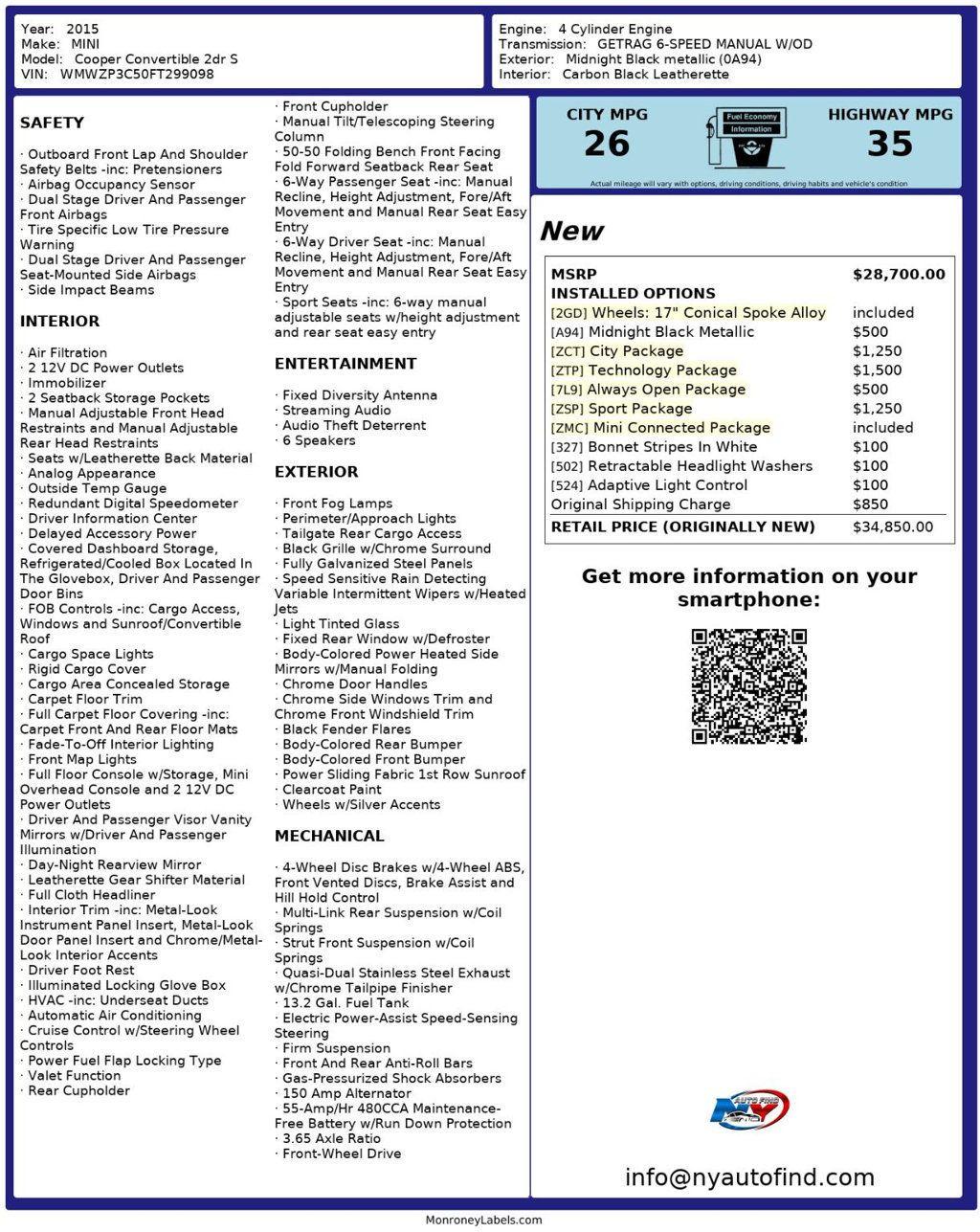 Take a look at this Midnight Black Metallic 2015 MINI Cooper S Convertible with Carbon Black Leatherette Interior and only 94,062 miles. This car delivers clean, cool and dark looks that combine so well with the fun feel of a convertible. It is very well maintained all around and also has low mileage and a ton of optional features. It is such a phenomenal find so don't miss it. It comes equipped with a 1.6L 4-cylinder Engine paired to a 6-speed Manual Transmission, Technology Package (with MINI Connected Package, MINI Visual Boost, MINI Wired Pack, Voice-Command, MINI Connected, Enhanced Bluetooth and USB, Smartphone Integration, Harman/Kardon Premium Sound, Satellite Radio, Center Armrest), Heated Front Seats, City Package (with Auto-Dimming Interior and Exterior Mirrors, Supplemental ZP1 Equipment, Auto-Dimming Rearview Mirror, Comfort Access Keyless Entry, Anti-Theft Alarm System, Power Folding Mirrors, Rear Park Distance Control), Sport Package (with 17 Conical Spoke Alloy Wheels, White Turn Signal Lights, Xenon Headlights, Dynamic Traction Control), Mini Connected Package (with MINI Visual Boost, MINI Wired Pack, Voice-Command, MINI Connected, Enhanced Bluetooth and USB, Smartphone Integration), White Bonnet Stripes, Retractable Headlight Washers, Adaptive Light Control, Cruise Control, Steering Wheel Controls, AM/FM Radio, Power Windows, Power Locks, Air Conditioning and so much more. Every NY Auto Find vehicle comes with a complimentary Limited Warranty and a Carfax Vehicle Report. Our vehicles are priced to sell quickly. Please call to check availability and schedule an appointment. -