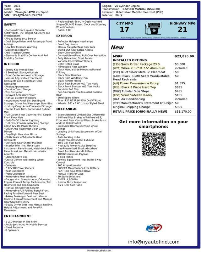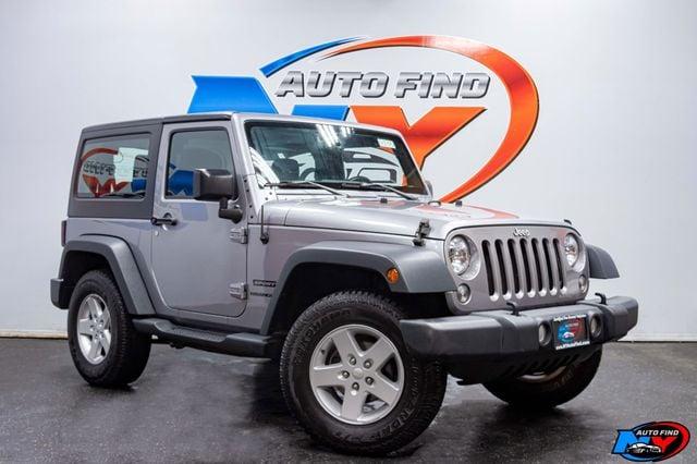 Take a look at this Billet Silver Metallic 2016 Jeep Wrangler Sport 4X4 with Black Cloth Interior, only One Owner and only 90,224 miles. This is one seriously rugged vehicle with a ton of useful options and low mileage. This truck also shines with as much visual appeal as it does with handling rugged terrain. The one and only owner of this vehicle maintained it extremely well, giving it the best of both looks and practicality. It comes equipped with a 3.6L 6-cylinder Engine paired to a 6-speed Manual Transmission, Four Wheel Drive, Quick Order Package 23S (with 17 Aluminum Wheels, 3.6L V6 24V VVT Engine, Leather Wrapped Steering Wheel, Chrome/Leather Wrapped Shift Knob), Power Convenience Group (with Power Heated Mirrors, Security Alarm, Power Locks, Remote Keyless Entry, Auto Dimming Mirror with Reading Lamp, Front 1-Touch Down Power Windows), Black 3 Piece Hard Top (with Rear Window Defroster, Rear Window Wiper/Washer, Tinted Rear Quarter and Liftgate Windows), Tubular Side Steps, Sirius Satellite Radio, Cruise Control, Steering Wheel Controls, AM/FM Radio, Power Windows, Power Locks, Air Conditioning and so much more. Every NY Auto Find vehicle comes with a complimentary Limited Warranty and a Carfax Vehicle Report. Our vehicles are priced to sell quickly. Please call to check availability and schedule an appointment. -