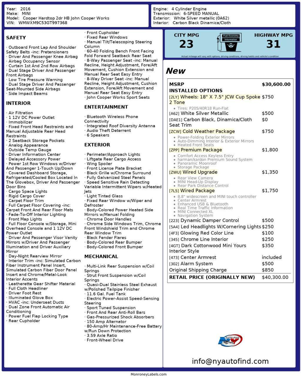 Take a look at this White Silver Metallic 2016 MINI Cooper Hardtop JCW John Cooper Works with Carbon Black Dinamica/Cloth Interior and only 57,488 miles. This car captivates you from the very first look with its uniquely gorgeous looks and cool wheels. But this car also has incredibly low mileage and a jaw dropping amount of options. It even has a Roadmaster Invisi-Brake. This car just may be all you ever wanted. It comes equipped with a 2.0L 4-cylinder Engine paired to a 6-speed Manual Transmission, Premium Package (with Panoramic Sunroof, Harman Kardon Premium Sound System, Comfort Access Keyless Entry, Storage Package), Wired Package (with Navigation System, MINI Connected XL, 8.8 Widescreen and MINI Touch Controller, Enhanced USB and Bluetooth, Real Time Traffic Information, Center Armrest), Wired Upgrade (with Rear View Camera, MINI Head-Up Display, Rear Park Distance Control), Cold Weather Package (with Heated Front Seats, Auto-Dimming Interior and Exterior Mirrors, Power -Folding Exterior Mirrors), Roadmaster Invisi-Brake, 18 JCW Cup Spoke 2 Tone Wheels, Dynamic Damper Control, LED Headlights with Cornering Lights, Glowing Red Color Line, Chrome Line Interior, Dark Cottonwood Mini Yours Interior Style, Alarm System, Bluetooth, Center Armrest, Cruise Control, Steering Wheel Controls, AM/FM Radio, Power Windows, Power Locks, Air Conditioning and so much more. Every NY Auto Find vehicle comes with a complimentary Limited Warranty and a Carfax Vehicle Report. Our vehicles are priced to sell quickly. Please call to check availability and to schedule an appointment. -