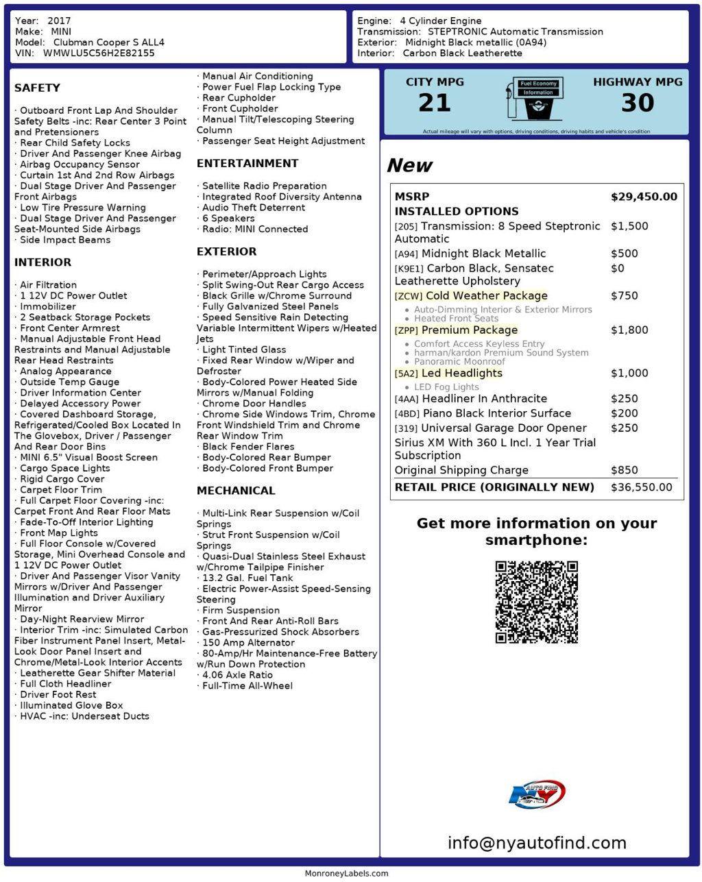 Take a look at this Midnight Black Metallic 2017 MINI Cooper S Clubman ALL4 with Carbon Black Leatherette Interior, a Clean Carfax and only 79,365 miles. This is your lucky day because you have come across one amazing find. This car checks all the boxes from a super clean history, low mileage, gorgeous looks and a ton of optional features. This is a seriously memorable car, so be sure to call us now. It comes equipped with a 2.0L 4-cylinder Engine paired to a 6-speed Automatic Transmission, All Wheel Drive, Premium Package (with Panoramic Sunroof, Harman/Kardon Premium Sound System, Comfort Access Keyless Entry), Cold Weather Package (with Heated Front Seats, Auto-Dimming Interior and Exterior Mirrors), LED Headlights, LED Fog Lights, Headliner in Anthracite, Piano Black Interior Surface, Universal Garage Door Opener, Cruise Control, Steering Wheel Controls, AM/FM Radio, Power Windows, Power Locks, Air Conditioning and so much more. Every NY Auto Find vehicle comes with a complimentary Limited Warranty and a Carfax Vehicle Report. Our vehicles are priced to sell quickly. Please call to check availability and schedule an appointment. -