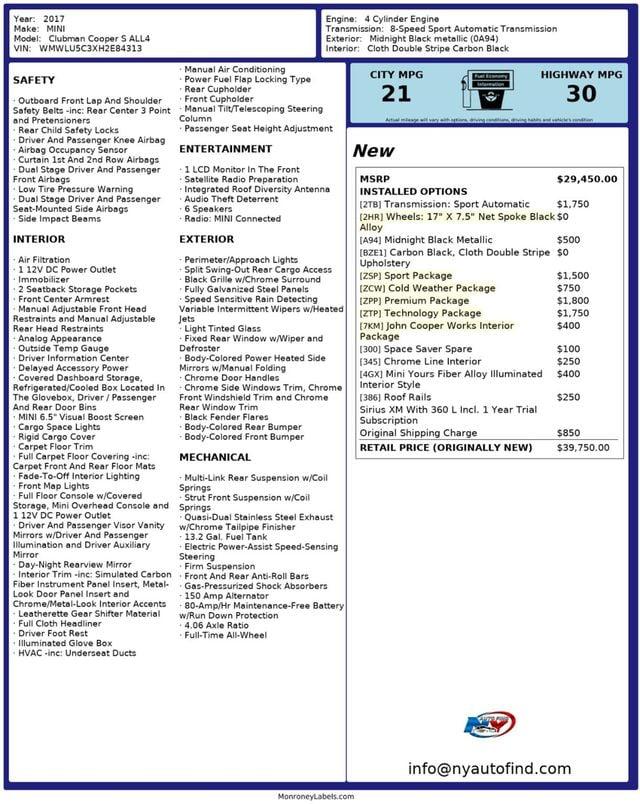 Take a look at this Melting Black Metallic 2017 MINI Cooper S Clubman ALL4 with Carbon Black Cloth Interior. There may not be another MINI with this level of dark appeal. It is such an attractive car with a cool and very clean interior. It also has an incredible amount of amazing options and packages. It's really a boat load of features. This is one seriously impressive car so don't miss it. It comes equipped with a 2.0L 4-cylinder Engine paired to an 8-speed Sport Automatic Transmission, All Wheel Drive, Premium Package (with Panoramic Sunroof, Harman Kardon Premium Sound System, Comfort Access Keyless Entry), Technology Package (with On-Board Navigation, MINI Wired Package, Traffic Information, MINI Connected XL, Rear View Camera, Rear Park Distance Control), Sport Package (with LED Headlights, LED Fog Lights, Dynamic Damper Control), Cold Weather Package (with Heated Front Seats, Auto-Dimming Interior and Exterior Mirrors), John Cooper Works Interior Package (with John Cooper Works Door Sill Finishers and Stainless Steel Pedals and Footrest, Headliner in Anthracite, John Cooper Works Leather Steering Wheel), 17 Net Spoke Black Alloy Wheels, Space Saver Spare, Chrome Line Interior, Mini Yours Fiber Alloy Illuminated Interior Style, Roof Rails, Sirius XM, Cruise Control, Steering Wheel Controls, AM/FM Radio, Power Windows, Power Locks, Air Conditioning and so much more. Every NY Auto Find vehicle comes with a complimentary Limited Warranty and a Carfax Vehicle Report. Our vehicles are priced to sell quickly. Please call to check availability and schedule an appointment. -