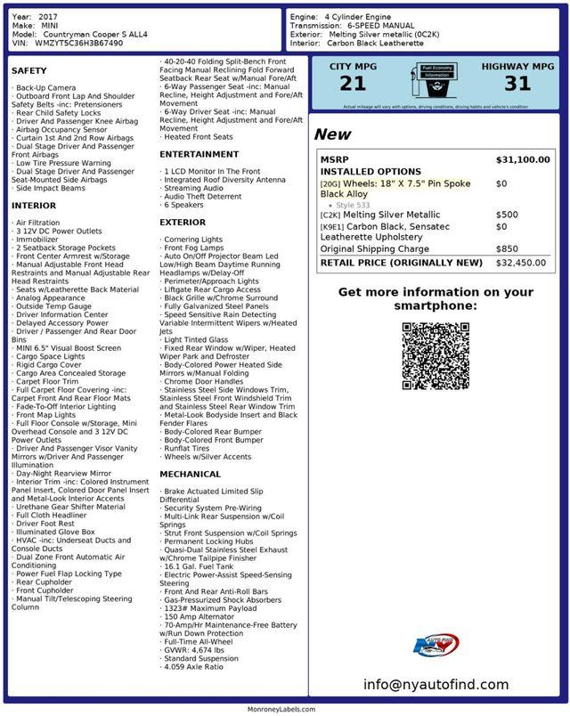 Take a look at this Melting Silver Metallic 2017 MINI Cooper S Countryman ALL4 with Carbon Black Leatherette Interior and only 66,200 miles. This car is absolutely glowing with shining surfaces and eye catching looks. The wheels are simply impressive and the surfaces are so well maintained. It also has very low mileage, making this a truly memorable vehicle. It comes equipped with a 2.0L 4-cylinder Engine paired to a 6-speed Manual Transmission, All Wheel Drive, Panoramic Sunroof, 18 Pin Spoke Black Alloy Wheels, Backup Camera, Heated Front Seats, Cruise Control, Steering Wheel Controls, AM/FM Radio, Power Windows, Power Locks, Air Conditioning and so much more. Every NY Auto Find vehicle comes with a complimentary Limited Warranty and a Carfax Vehicle Report. Our vehicles are priced to sell quickly. Please call to check availability and schedule an appointment. -