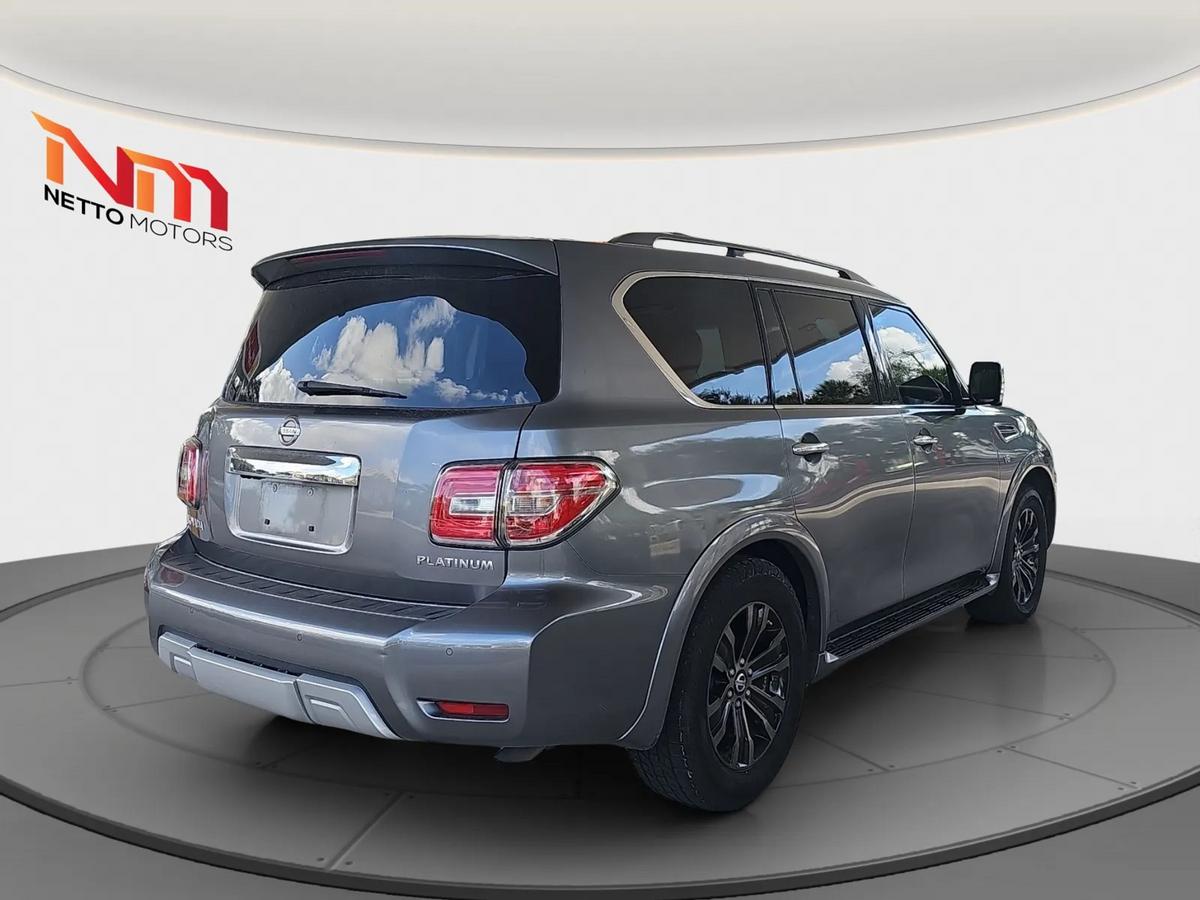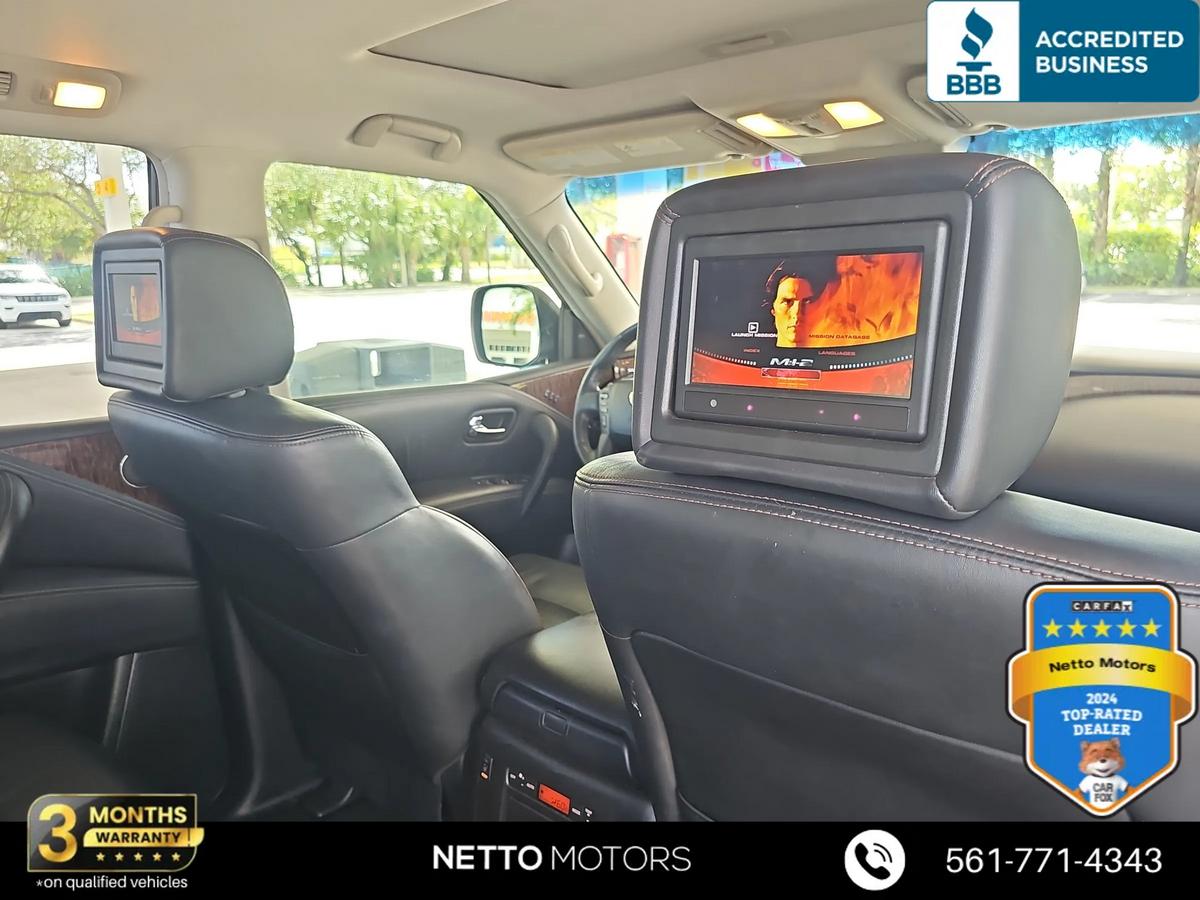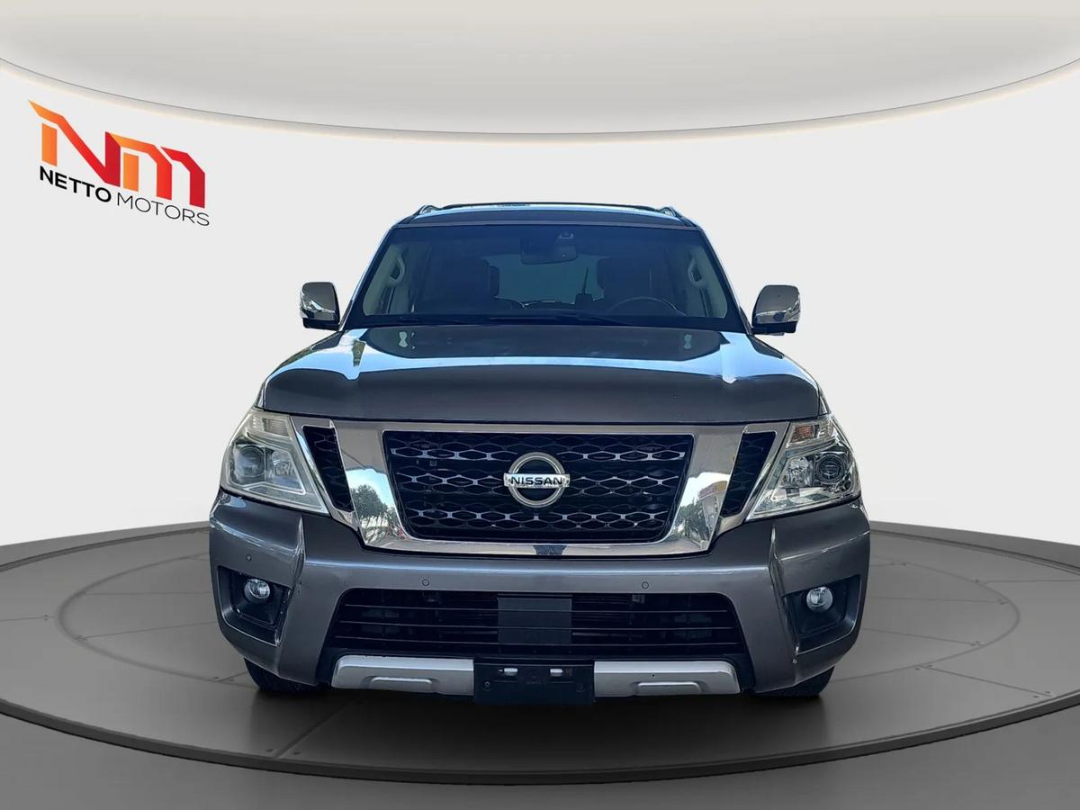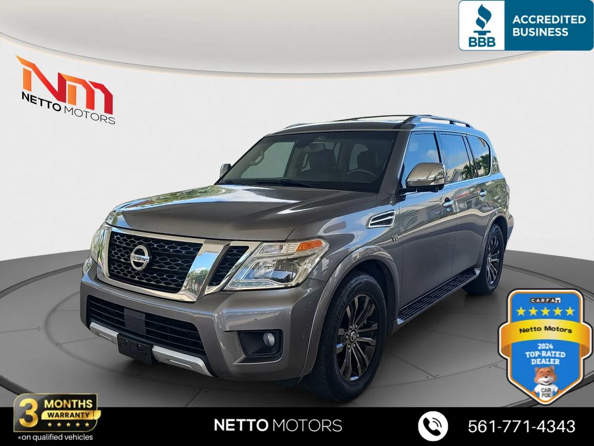 Vehicle Details2017 Nissan Armada Platinum 4WD V8 West Palm Beach's best-priced full-size SUV. This rugged yet refined Nissan Armada pairs a powerful 5.6L V8 gasoline engine with four-wheel drive for confident towing, highway cruising, and family adventures in every season. Inside, premium leather seats and Platinum trim heighten comfort for long drives, while a BOSE stereo delivers immersive sound for road-trip playlists. Convenience features include rear parking sensors and a back-up camera to make parking effortless, plus hands-free Bluetooth for safe calling and media streaming on the go.This Nissan Armada Platinum is loaded with creature comforts and tech you want: spacious third-row seating, generous cargo capacity, and a refined interior that balances utility with upscale touches. The robust V8 provides strong acceleration and towing capability, ideal for hauling boats, trailers, or weekend gear around West Palm Beach and beyond. With four-wheel drive, this Nissan Armada handles coastal roads and unexpected weather with ease.Priced to sell this is the best price you'll find for a 2017 Nissan Armada Platinum in the area. Whether you need a family hauler, towing workhorse, or comfortable commuter, this Nissan Armada delivers capability, luxury, and value. Located in West Palm Beach, FL, ready for test drives and immediate delivery. Don't miss this great-value full-size SUV with top-tier features and performance. Contact today to schedule a viewing.EquipmentCarry lots of cargo while your passengers are comfortable. This 1/2 ton suv has four wheel drive capabilities. It has auto-adjust speed for safe following. This model keeps you comfortable with Auto Climate. This model features a high end BOSE stereo system. See what's behind you with the back up camera on this 1/2 ton suv. Maintaining a stable interior temperature in this vehicle is easy with the climate control system. The Nissan Armada features cruise control for long trips. The Electronic Stability Control will keep you on your intended path. This 2017 Nissan Armada has a V8, 5.6L high output engine. The fog lights cut through the weather so you can see what's ahead. This 2017 Nissan Armada is equipped with a gasoline engine. Bluetooth technology is built into the Nissan Armada, keeping your hands on the steering wheel and your focus on the road. This 1/2 ton suv is pure luxury with a heated steering wheel. The leather seats in this 1/2 ton suv are a must for buyers looking for comfort, durability, and style. Help alleviate lower back pain with the driver seat lumbar support in this vehicle. You'll never again be lost in a crowded city or a country region with the navigation system on this 2017 Nissan Armada . Load groceries and much more with ease into the vehicle thanks to the power liftgate. The rear parking assist technology on the Nissan Armada will put you at ease when reversing. The system alerts you as you get closer to an obstruction.PackagesRoof Rail Cross Bars 2nd and 3rd Row Carpeted Mats Cargo Area Protector Cargo Net and First Aid Kit **Equipment listed is based on original vehicle build and subject to change. Please confirm the accuracy of the included equipment by calling the dealer prior to purchase.**Additional InformationWE SHIP NATIONALLY AND WORLDWIDE--PLEASE ASK ABOUT OUR LOW RATES***although every reasonable effort has been made to ensure the accuracy of the information contained on this site, absolute accuracy cannot be guaranteed. This site, and all information and materials appearing on it, are presented to the user as is without warranty of any kind, either expressed or implied. All vehicles are subject to prior sale. Although we try to remove SOLD units as quickly as possible, due to our high inventory turnover it is possible that some may remain online so please call in advance to ensure that the vehicle of interest is in stock. Price does not include applicable tax, title, license, electronic processing and/or documentation fees, and destination charges. While great effort is made to ensure the accuracy of the information on this site, errors do occur so please verify information with a customer service representative. This is easily done by calling us at 561-771-4343 or by visiting us at the dealership.