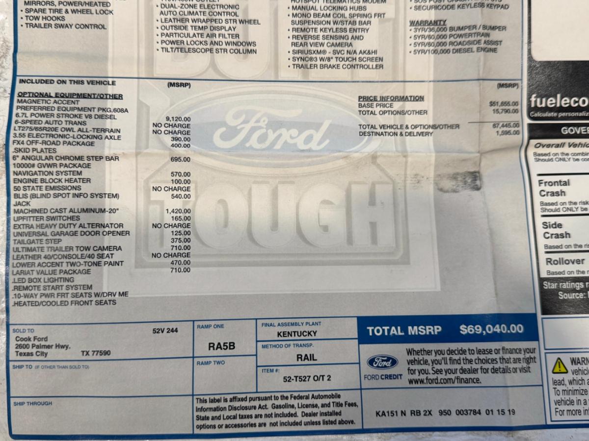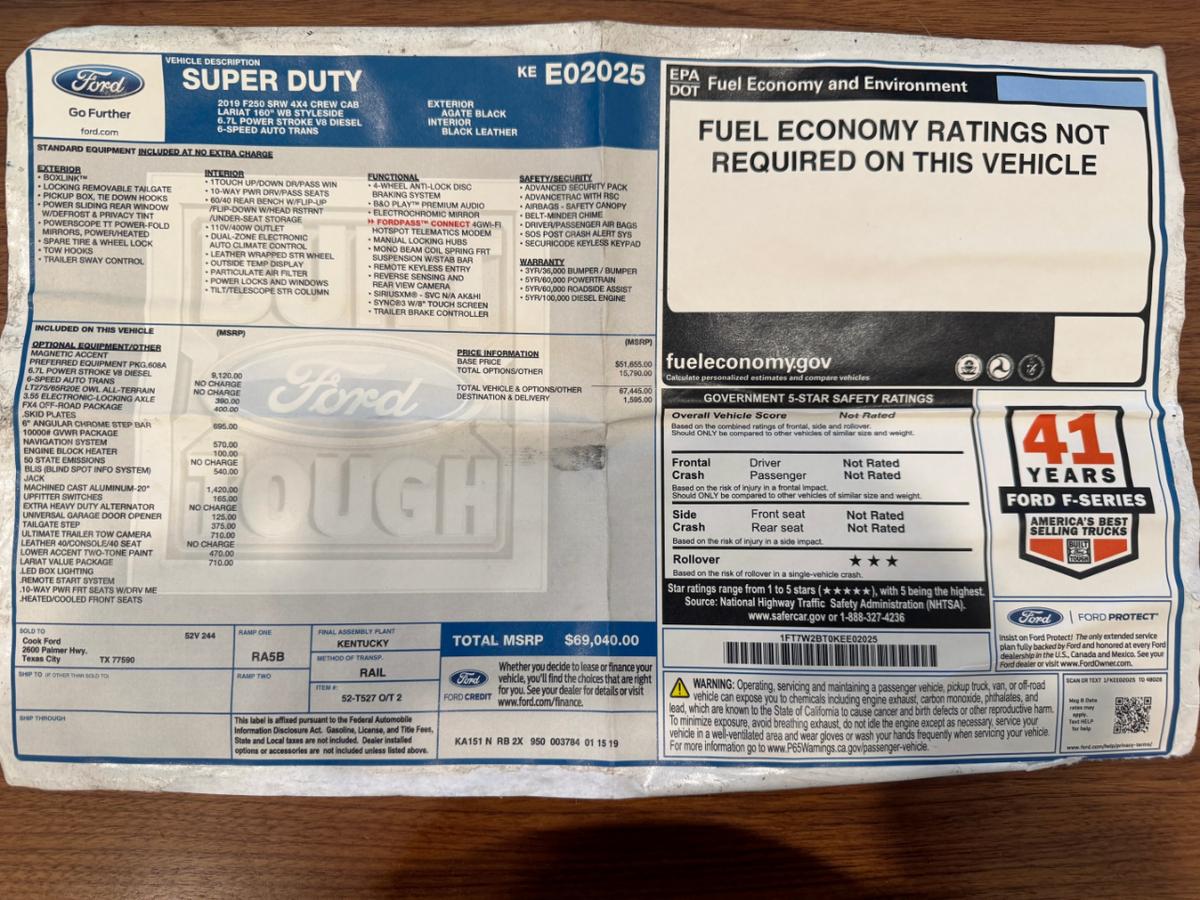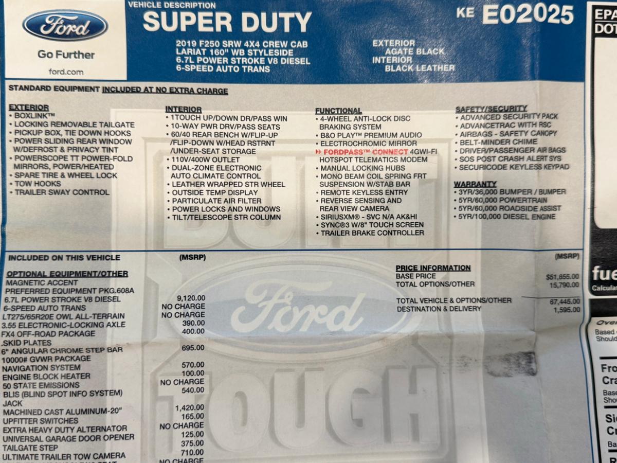 IN MAKE READY !!!PLEASE CALL ONE OF OUR SALES ASSOCIATES AT 713-489-2380 FOR PERSONAL ASSISTANCE AND TO GET MORE INFORMATION ABOUT THIS VEHICLE.WE ARE LOCATED AT 12423 W SAM HOUSTON PKWY S HOUSTON TX 77031ADDITIONAL SIMILLAR UNITS IN STOCKTHIS VEHICLE QUALIFIES FOR EXTENDED WARRANTY STARTING AT $2590 HIGHLIGHTS:2019 FORD F-250 SUPER DUTY LARIATVIN: 1FT7W2BT0KEE02025FLATBEDCREW PICKUPREAR WHEEL DRIVE W/ 4X4Original Window StickerNO ACCIDENTS OR DAMAGE REPORTED TO CARFAX1 OWNER PER CARFAX6.7L POWER STROKE V8 DIESEL6-SPEED AUTO TRANS3.55 ELECTRONIC-LOCKING AXLEFX4 OFF ROADSKID PLATESNAVIGATION SYSTEMUPFITTER SWITCHESUNIVERSAL GARAGE DOOR OPENERLEATHER SEATLARIAT VALUE PACKAGEHEATED/COOLED FRONT SEATSUNDER-SEAT STORAGEDUAL-ZONE ELECTRONIC AUTO CLIMATE CONTROLLEATHER WRAPPED STR WHEELOUTSIDE TEMP DISPLAYPOWER LOCKS AND WINDOWSTILT/TELESCOPE STR COLUMNB&O PLAY PREMIUM AUDIOREMOTE KEYLESS ENTRY8 TOUCH SCREENTRAILER BRAKE CONTROLLERAND MANY MORE ... Flying in to Houston to pick up your vehicle? For your convenience we offer FREE ride from IAH and HOU airports in Houston to our dealershipWe look forward to creating the best buying experience for you. Please be advised there may exist a chance for you to lose your desired vehicle to another buyer. Please know all our vehicles are actively listed online and available for sale to other potential customers. We strongly recommend that a $500.00 deposit be made to hold your vehicle until the purchase is complete.All financial transactions should be completed within a reasonable period of time usually within six days after we receive the deposit.We accept and prefer PayPal deposit made to sales@everestmotorsinc.com. We accept major credit cards and debit cards for $500.00 ONLY.***ALL DEPOSITS ARE NON-REFUNDABLE***All our Vehicles are sold as is where is with no warranty expressed written or implied. The Seller shall not be responsible for the correct description authenticity genuineness or defects herein and makes no warranty in connection therewith. No allowance or set a side will be made on account of any incorrectness imperfection defect or damage. Any descriptions or representations are for identification purposes only and are not to be construed as a warranty of any type. It is the responsibility of the buyer to have thoroughly inspected the vehicle and to have satisfied himself or herself as to the condition and value and to buy based upon that judgement solely. The seller shall and will make every reasonable effort to disclose any known defects associated with this vehicle at the buyer's request prior to the close of sale. Seller assumes no responsibility for any repairs regardless of any oral statements about the vehicle.All buyers are responsible to pay Texas V.I.T tax (Vehicle Inventory Tax). Which is 0.002018 of the purchase price (Example: $10000.00 purchase = $20.18) $225.00 documentary fee $10.00 buyers tag fee and a $295.00 dealer preparation fee Texas buyers must pay 6.25% sales tax plus $137.00 registration fee. Out-Of state buyers are responsible to pay their tax within 21 days of purchase.Everest Motors Inc Advantage Plus:For just $1499.00 customers can enjoy Everest Motors' customized app for your vehicle offering unlimited access to location services custom alerts (including theft geofencing after-hours activity and speed monitoring) recovery support with law enforcement and 24/7/365 lifetime GPS tracking along with many other featuresall with no subscription fees.Additionally the package includes:3 Years of Key Replacement3 Years of Paintless Dent Removal3 Years of Windshield ProtectionCustomers can view the full program details at Our Store/Terms.The Everest Motors Inc. Advantage Plus program also provides exclusive benefits:A $500 trade-in coupon for future trades.A $250 referral check for every referred buyer who purchases a vehicle from Everest Motors Inc.This nationwide program applies to every deal unless otherwise discussed with the customer ensuring maximum value and peace of mind. Visit Everest Motors Inc. online at www.everestmotorsinc.com to see more pictures of this vehicle or call us at 713-489-2380 today to schedule your test drive.