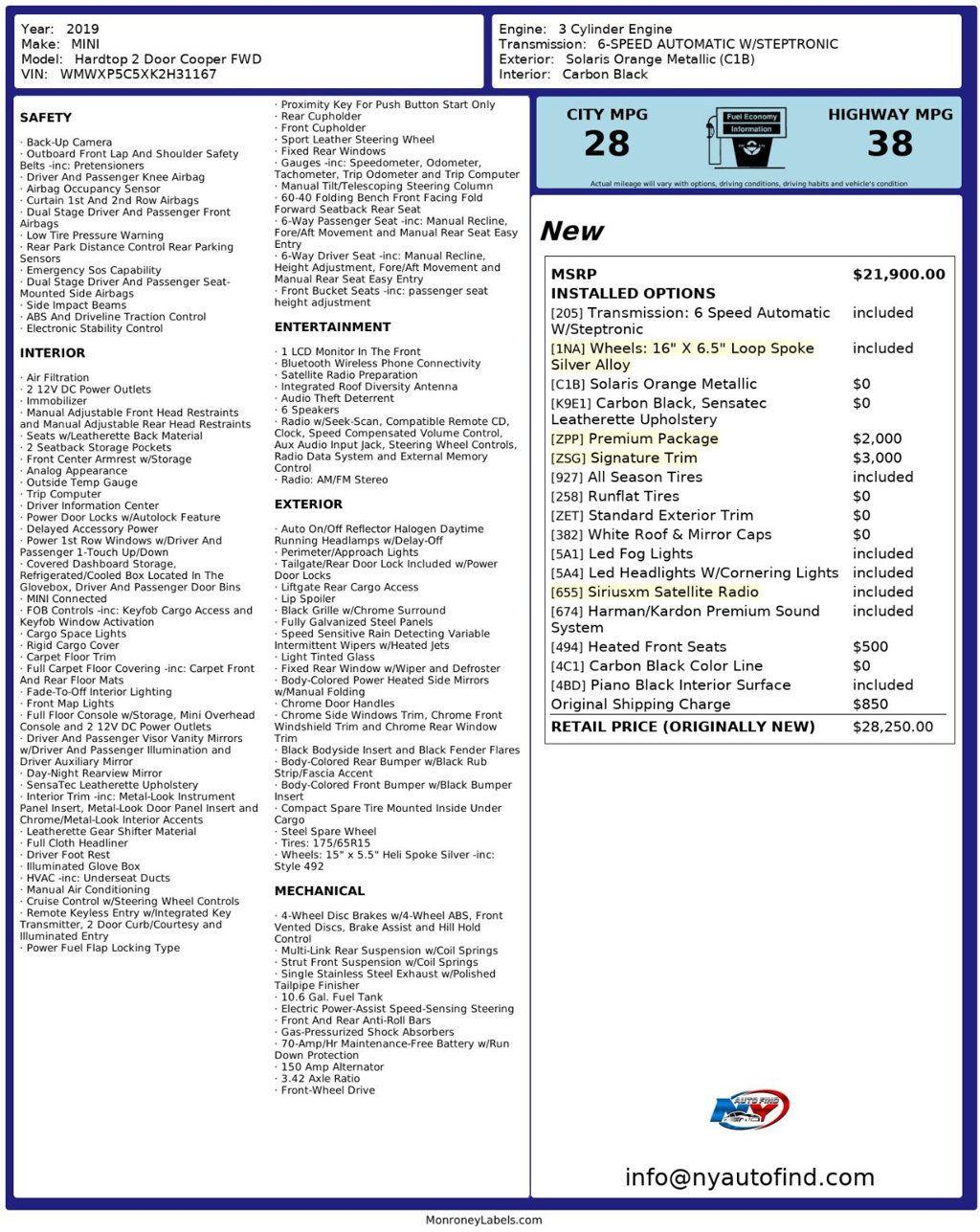 Take a look at this Solaris Orange Metallic 2019 MINI Cooper Hardtop with Carbon Black Leatherette Interior and a Clean Carfax. This is a car that is sure to turn heads. It is a confidence inspiring vehicle with gorgeous, sporty looks and a boat load of amazing options including the valuable Signature Trim. Best of all, it also has a super clean history so come and claim this amazing find now. It comes equipped with a 1.5L 3-cylinder Engine paired to a 6-speed Automatic Transmission, Signature Trim (with Panoramic Sunroof, Piano Black Interior Surface, Automatic Climate Control, MINI Excitement Package, Comfort Access Keyless Entry, 16 Loop Spoke Silver Alloy Wheels, White Turn Signal Lights), Premium Package (with Auto-Dimming Interior and Exterior Mirrors, Harman Kardon Premium Sound System, Power-Folding Mirrors, Chrome Line Exterior, LED Fog Lights, SiriusXM Satellite Radio, LED Headlights with Cornering Lights), Backup Camera, White Roof and Mirror Caps, Heated Front Seats, Carbon Black Color Line, Bluetooth Wireless Phone Connectivity, Cruise Control, Steering Wheel Controls, AM/FM Radio, Power Windows, Power Locks, Air Conditioning and so much more. Every NY Auto Find vehicle comes with a complimentary Limited Warranty and a Carfax Vehicle Report. Our vehicles are priced to sell quickly. Please call to check availability and to schedule an appointment. -