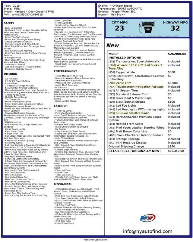 Take a look at this Pepper White 2019 MINI Cooper S Hardtop with Malt Brown Leather Interior and a Clean Carfax. This is a classy, sporty and fun car that is nothing short of iconic. In fact, this car has the Iconic Trim which brings this vehicle up to the very top level. But this particular MINI has a super clean history and a simply stunning interior which puts it in a league all by itself. It just doesn't get better than this, so make sure to call us now. It comes equipped with a 2.0L 4-cylinder Engine paired to a 7-speed Automatic Transmission, Iconic Trim (with Panoramic Sunroof, LED Fog Lights, Active Driving Assistant, LED Headlights with Cornering Lights, Chrome Interior Trim, Storage Package, Heated Front Seats, Auto-Dimming Interior and Exterior Mirrors, Comfort Access Keyless Entry, Harman/Kardon Premium Sound System, Power-Folding Mirrors, Piano Black Interior Surface, Automatic Climate Control, SiriusXM Satellite Radio, Piano Black Exterior, MINI Head-Up Display), Touchscreen Navigation Package (with MINI Navigation, Wireless Charging & Enhanced Bluetooth, Apple CarPlay Compatibility, MINI Connected Services, Advanced Real-Time Traffic Information, Remote Services, MINI Assist eCall, MINI TeleServices, MINI Connected XL), 17 Rail Spoke 2 Tone Alloy Wheels, Chesterfield Leather Upholstery, Black Roof & Mirror Caps, Black Bonnet Stripes, Malt Brown Color Line, Cruise Control, Steering Wheel Controls, AM/FM Radio, Power Windows, Power Locks, Air Conditioning and so much more. Every NY Auto Find vehicle comes with a complimentary Limited Warranty and a Carfax Vehicle Report. Our vehicles are priced to sell quickly. Please call to check availability and to schedule an appointment. -