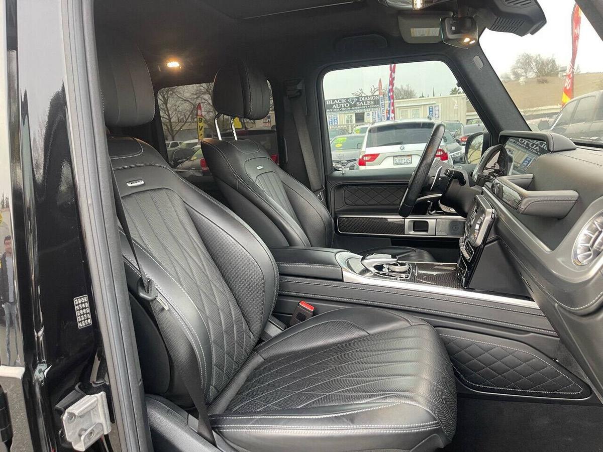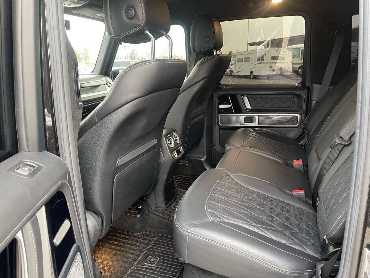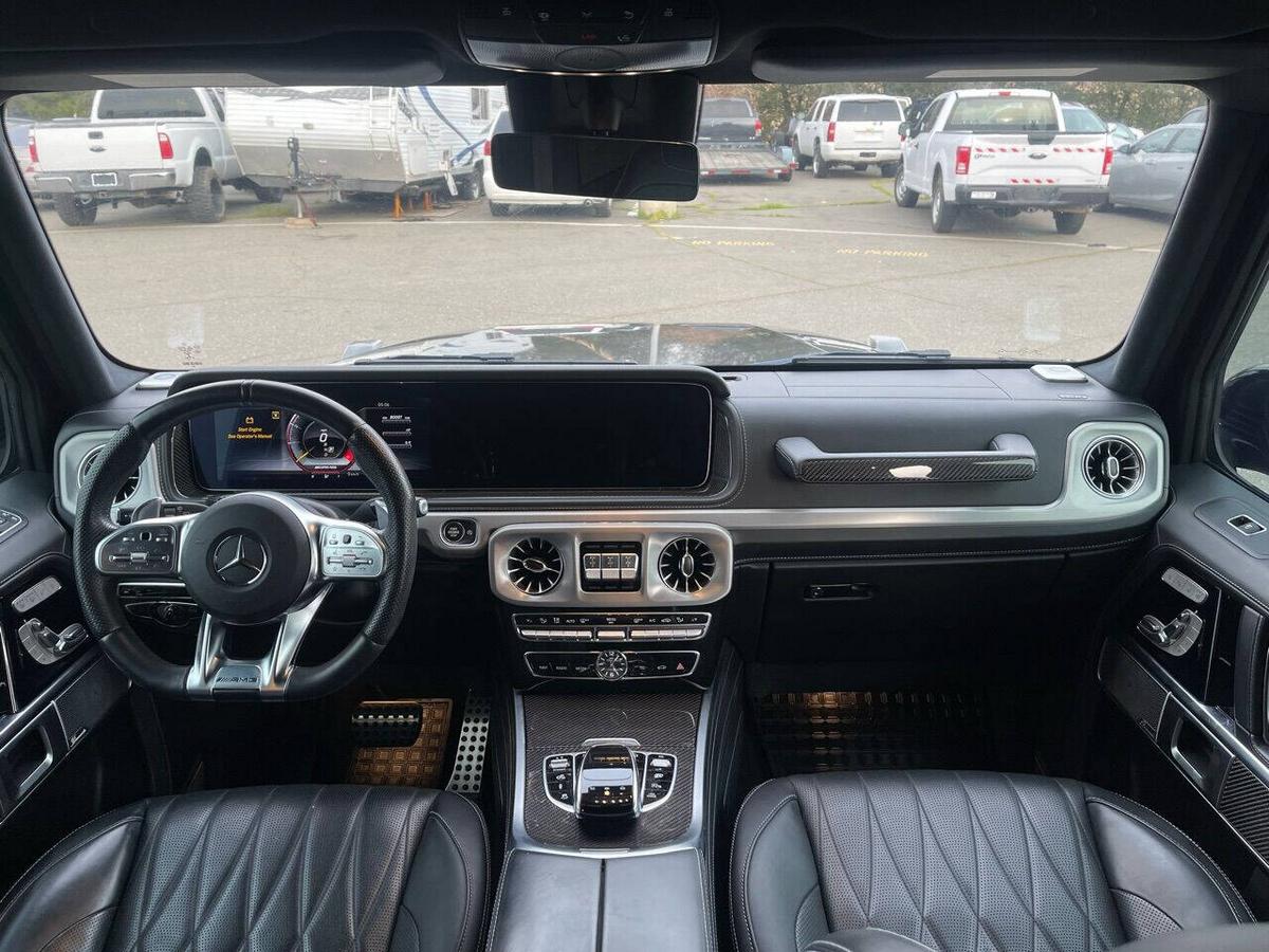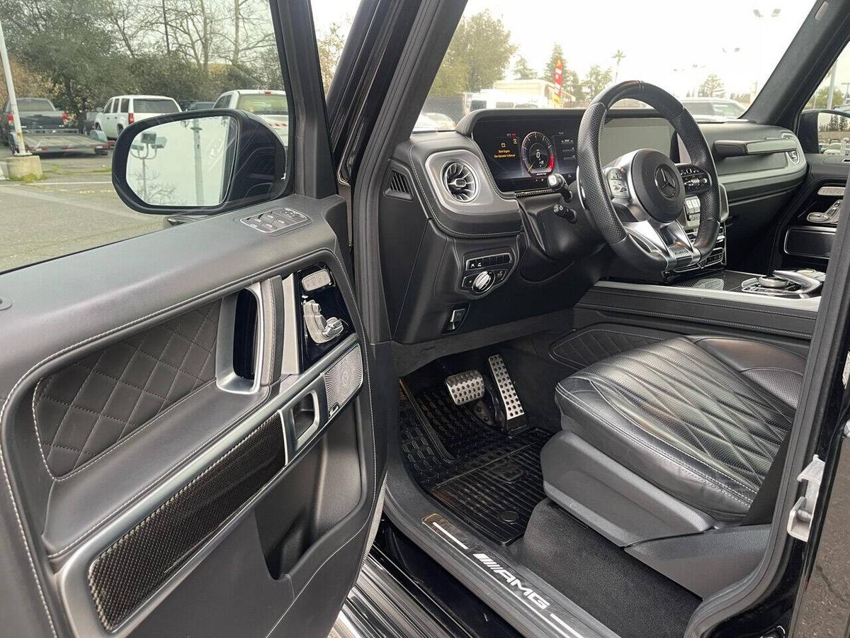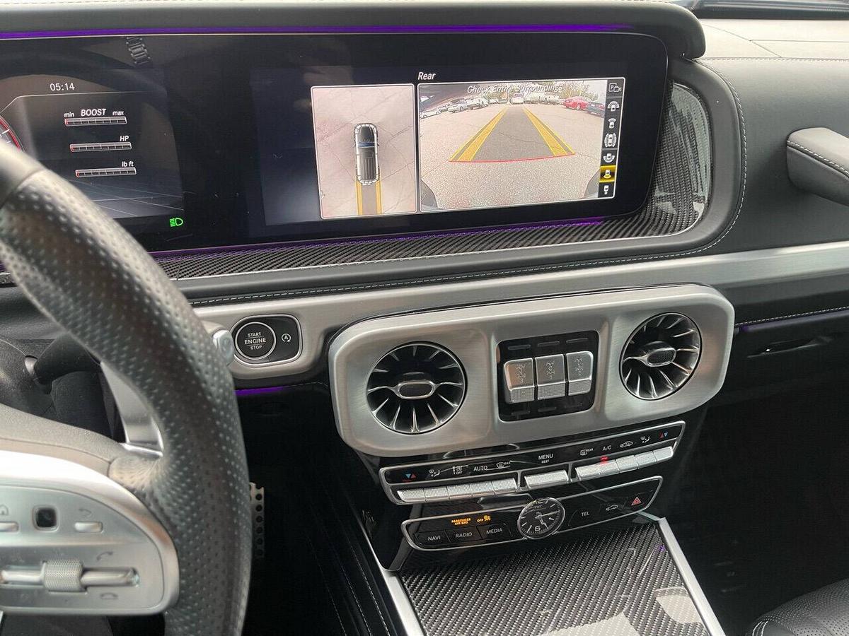 Dealer Notes G 63 AMG 4MATIC , 4D Sport Utility, V8, 9-Speed Automatic, 4MATIC , Black w/designo Exclusive Nappa Leather Upholstery, 15 Speakers, AMG Front/Rear Red Brake Calipers, AMG Night Package, AMG Top Speed Delimiter, Black Under Guard Protection, Brush Guard in Black, Burmester Surround Sound System, Exclusive Interior Package Plus, Exclusive Nappa Leather Trim, Gunmetal Grille, Heated Front Seats, Heated rear seats, Nappa Leather Trim, Navigation System, Night Package, Obsidian Black Elements, Power moonroof, Spare Wheel Cover in Obsidian Black, Wheels: 22 AMG Matte Black Cross-Spoke Forged. 2020 Mercedes-Benz G-Class G 63 AMG 4MATIC Obsidian Black Metallic 4MATIC 9-Speed Automatic V8 Highlighted Features *Emergency communication system *Navigation system *Lane departure *Leather upholstery *Automatic temperature control *Power moonroof *Wireless phone connectivity *Parking sensors Detailed Specifications ~Convenience Features 1-touch down Adaptive Cruise Control: Active Distance Assist DISTRONIC Air conditioning Auto tilt-away steering wheel Auto-dimming rearview mirror Automatic temperature control Driver door bin Driver vanity mirror Emergency communication system: Mercedes me connect (3 years included) Front beverage holders Front dual zone A/C Garage door transmitter Head restraints memory Illuminated entry Memory seat Navigation system Overhead console Passenger door bin Passenger vanity mirror Power moonroof Power windows Proximity key: push button start only Rear air conditioning Rear beverage holders Rear door bins Remote engine start: smart device only Remote keyless entry Residual heat recirculation Speed control Steering wheel memory Telescoping steering wheel Tilt steering wheel ~Suspension/Handling Adaptive suspension Alloy wheels Front anti-roll bar Front wheel independent suspension Power steering Rear anti-roll bar Speed-sensing steering Sport suspension ~Entertainment Features 1st row LCD monitors: 2 AM/FM radio: SiriusXM Diversity antenna Primary LCD size: 12.3 Radio data system Satellite radio trial duration with new vehicle purchase (months): 6 Smart device integration: Apple CarPlay/Android Auto Speaker type: Burmester Speakers: 15 Steering wheel mounted audio controls Turn-by-turn navigation directions: Mercedes me connect Concierge Wireless phone connectivity: Bluetooth ~Seats And Trim Front center armrest Front seats: bucket Genuine wood console insert Genuine wood dashboard insert Genuine wood door panel insert Heated front seats Heated rear seats Leather upholstery Max seating capacity: 5 Power 4-way driver lumbar support Power 4-way passenger lumbar support Power driver seat Power passenger seat Rear seat center armrest Rear seats: split-bench Rear seats Folding position: flip forward cushion/seatback Split folding rear seat Sport steering wheel ~Powertrain Compressor: twin turbo Cylinder configuration: V-8 Cylinder deactivation Drive type: AMG Performance 4MATIC Engine liters: 4.0 Engine location: front Front locking differential Fuel economy city: 13mpg Fuel economy combined: 14mpg Fuel economy highway: 15mpg Fuel tank capacity: 26.4gal. Horsepower: 577hp @ 6,000RPM Limited slip differential: electro-mechanical Manual-shift auto: AMG SPEEDSHIFT TCT Mode select transmission Number of valves: 32 Rear locking differential Recommended fuel: Premium Unleaded Torque: 627 lb.-ft. @ 2,500RPM Transmission: 9 speed automatic Variable intake manifold Variable valve control ~Off-Road Capability Approach angle: 27 deg Departure angle: 29 deg Ground clearance (max): 267mm (10.5) Ground clearance (min): 241mm (9.5) Ramp breakover angle: 25 deg ~Body Exterior Auto-dimming door mirrors Bodyside moldings Bumpers: body-color Door mirrors: body-color