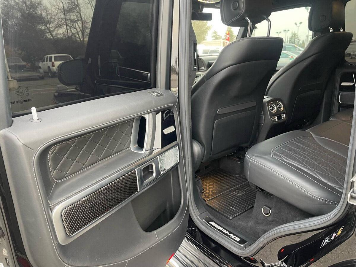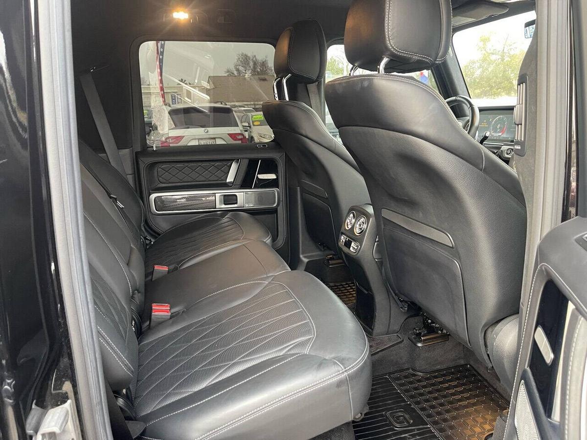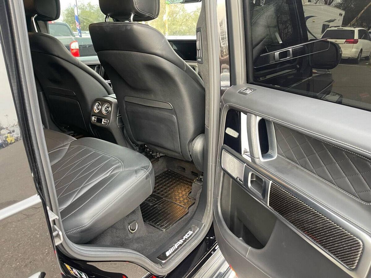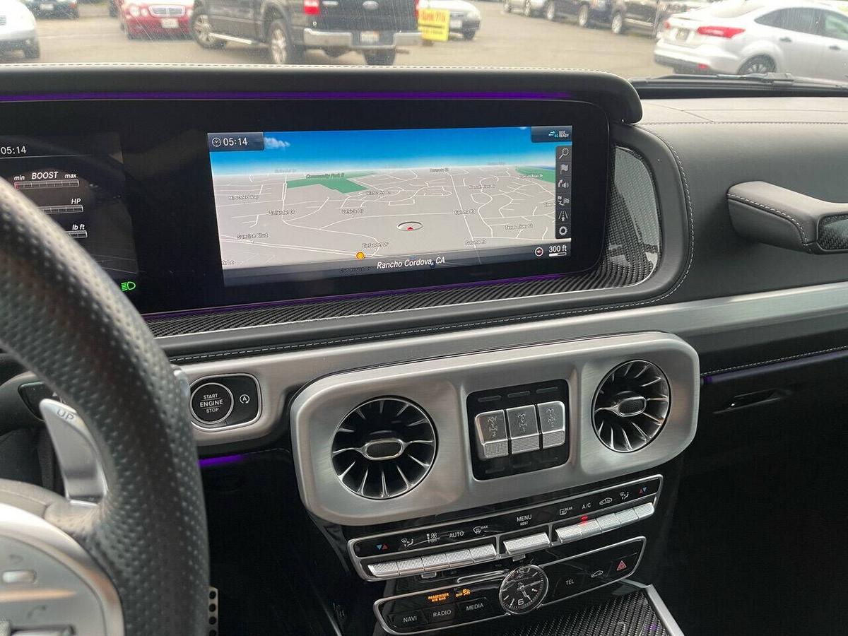 Dealer Notes G 63 AMG 4MATIC , 4D Sport Utility, V8, 9-Speed Automatic, 4MATIC , Black w/designo Exclusive Nappa Leather Upholstery, 15 Speakers, AMG Front/Rear Red Brake Calipers, AMG Night Package, AMG Top Speed Delimiter, Black Under Guard Protection, Brush Guard in Black, Burmester Surround Sound System, Exclusive Interior Package Plus, Exclusive Nappa Leather Trim, Gunmetal Grille, Heated Front Seats, Heated rear seats, Nappa Leather Trim, Navigation System, Night Package, Obsidian Black Elements, Power moonroof, Spare Wheel Cover in Obsidian Black, Wheels: 22 AMG Matte Black Cross-Spoke Forged. 2020 Mercedes-Benz G-Class G 63 AMG 4MATIC Obsidian Black Metallic 4MATIC 9-Speed Automatic V8 Highlighted Features *Emergency communication system *Navigation system *Lane departure *Leather upholstery *Automatic temperature control *Power moonroof *Wireless phone connectivity *Parking sensors Detailed Specifications ~Convenience Features 1-touch down Adaptive Cruise Control: Active Distance Assist DISTRONIC Air conditioning Auto tilt-away steering wheel Auto-dimming rearview mirror Automatic temperature control Driver door bin Driver vanity mirror Emergency communication system: Mercedes me connect (3 years included) Front beverage holders Front dual zone A/C Garage door transmitter Head restraints memory Illuminated entry Memory seat Navigation system Overhead console Passenger door bin Passenger vanity mirror Power moonroof Power windows Proximity key: push button start only Rear air conditioning Rear beverage holders Rear door bins Remote engine start: smart device only Remote keyless entry Residual heat recirculation Speed control Steering wheel memory Telescoping steering wheel Tilt steering wheel ~Suspension/Handling Adaptive suspension Alloy wheels Front anti-roll bar Front wheel independent suspension Power steering Rear anti-roll bar Speed-sensing steering Sport suspension ~Entertainment Features 1st row LCD monitors: 2 AM/FM radio: SiriusXM Diversity antenna Primary LCD size: 12.3 Radio data system Satellite radio trial duration with new vehicle purchase (months): 6 Smart device integration: Apple CarPlay/Android Auto Speaker type: Burmester Speakers: 15 Steering wheel mounted audio controls Turn-by-turn navigation directions: Mercedes me connect Concierge Wireless phone connectivity: Bluetooth ~Seats And Trim Front center armrest Front seats: bucket Genuine wood console insert Genuine wood dashboard insert Genuine wood door panel insert Heated front seats Heated rear seats Leather upholstery Max seating capacity: 5 Power 4-way driver lumbar support Power 4-way passenger lumbar support Power driver seat Power passenger seat Rear seat center armrest Rear seats: split-bench Rear seats Folding position: flip forward cushion/seatback Split folding rear seat Sport steering wheel ~Powertrain Compressor: twin turbo Cylinder configuration: V-8 Cylinder deactivation Drive type: AMG Performance 4MATIC Engine liters: 4.0 Engine location: front Front locking differential Fuel economy city: 13mpg Fuel economy combined: 14mpg Fuel economy highway: 15mpg Fuel tank capacity: 26.4gal. Horsepower: 577hp @ 6,000RPM Limited slip differential: electro-mechanical Manual-shift auto: AMG SPEEDSHIFT TCT Mode select transmission Number of valves: 32 Rear locking differential Recommended fuel: Premium Unleaded Torque: 627 lb.-ft. @ 2,500RPM Transmission: 9 speed automatic Variable intake manifold Variable valve control ~Off-Road Capability Approach angle: 27 deg Departure angle: 29 deg Ground clearance (max): 267mm (10.5) Ground clearance (min): 241mm (9.5) Ramp breakover angle: 25 deg ~Body Exterior Auto-dimming door mirrors Bodyside moldings Bumpers: body-color Door mirrors: body-color