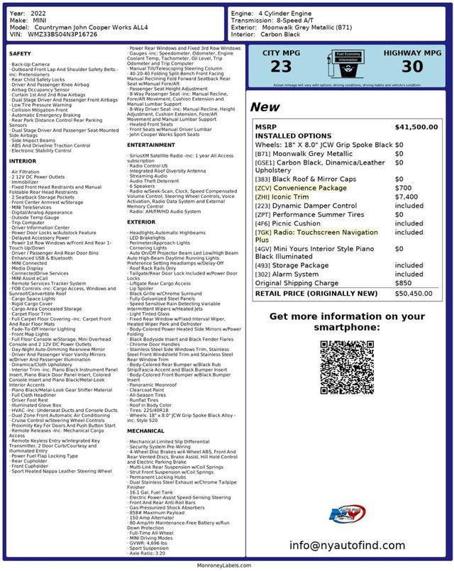 Take a look at this Moonwalk Grey Metallic 2022 MINI Countryman John Cooper Works ALL4 with Carbon Black Dinamica/Leather Interior, a Clean Carfax, only One Owner and only 18,217 miles. This is the king of all MINIs. You will never find another one with this level of quality and coolness. This car has an ideal one owner, super clean history and the extremely valuable Iconic Trim which has a plethora of amazing upgrades. As if that weren't enough, this car also has very low mileage and an extremely rare factory Heated Steering Wheel and Harman Kardon Sound System which were only included in a very limited amount cars of this model. This is the vehicle of the century so do not miss it. It comes equipped with a 2.0L 4-cylinder Engine paired to an 8-speed Automatic Transmission, All Wheel Drive, Sport Heated Nappa Leather Steering Wheel, Iconic Trim (with MINI Navigation, MINI Head-Up Display, MINI Connected XL, Wireless Charging, Apple CarPlay Compatibility, Parking Assistant, Interior Surfaces Piano Black, Storage Package, Active Cruise Control, Dynamic Damper Control, Harman/Kardon Premium Sound System, 19 JCW Circuit Spoke 2-Tone Wheels, Alarm System, Power Tailgate, Power Front Seats, Piano Black Exterior Trim, Universal Garage Door Opener, Touchscreen Navigation Plus, Dynamic Digital Instrument Cluster, Advanced Real-Time Traffic Information, Concierge Services, Remote Services), Convenience Package (with Rear Center Armrest, Picnic Cushion, Alarm System), Panoramic Sunroof, Heated Front Seats, Backup Camera, Collision Mitigation, Rear Park Distance Control Rear Parking Sensors, Black Roof and Mirror Caps, Remote Keyless Entry, JCW Sport Seats, Cruise Control, Steering Wheel Controls, AM/FM/HD Radio, Power Windows, Power Locks, Air Conditioning and so much more. Every NY Auto Find vehicle comes with a complimentary Limited Warranty and a Carfax Vehicle Report. Our vehicles are priced to sell quickly. Please call to check availability and schedule an appointment. -