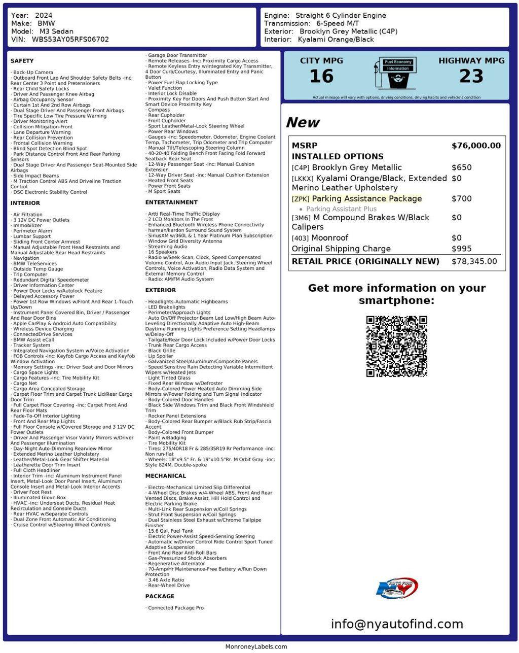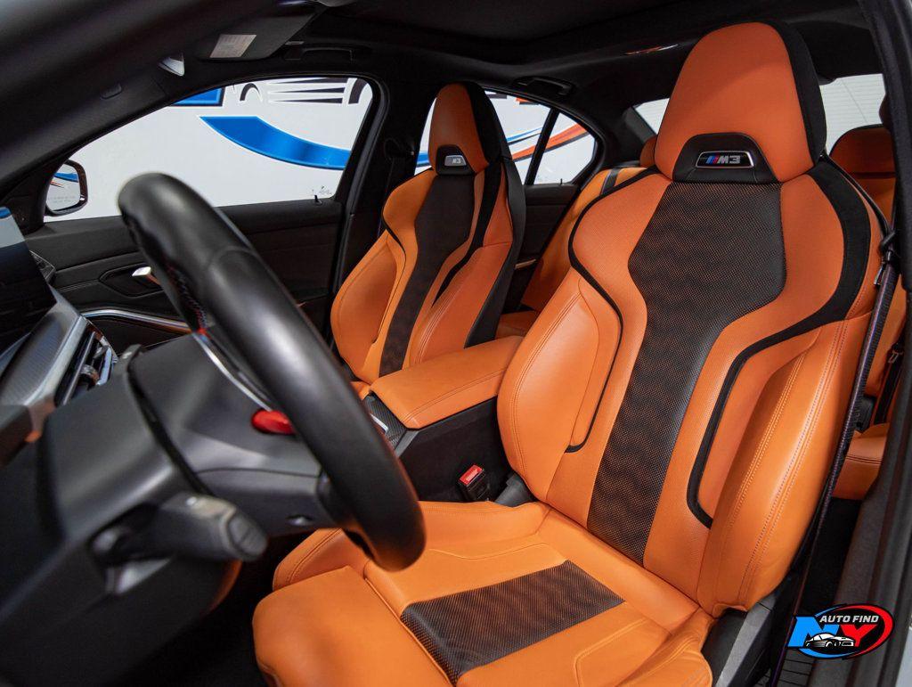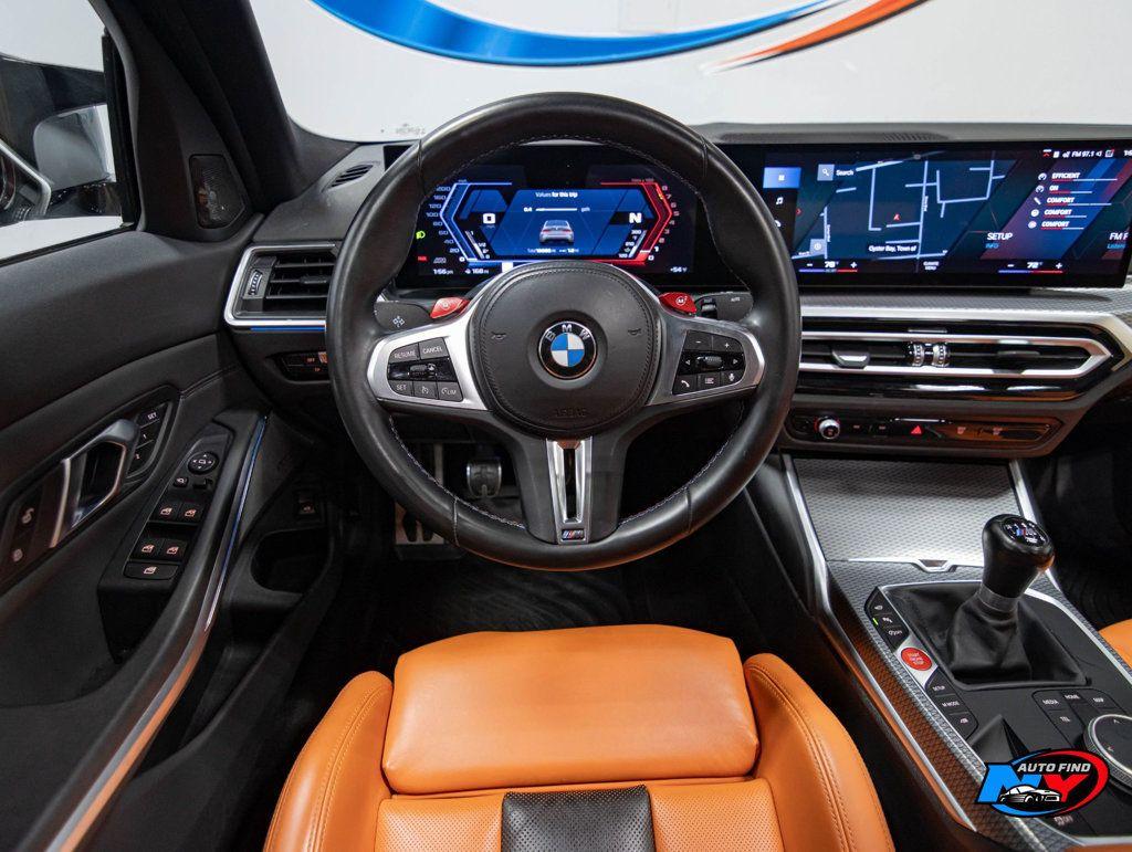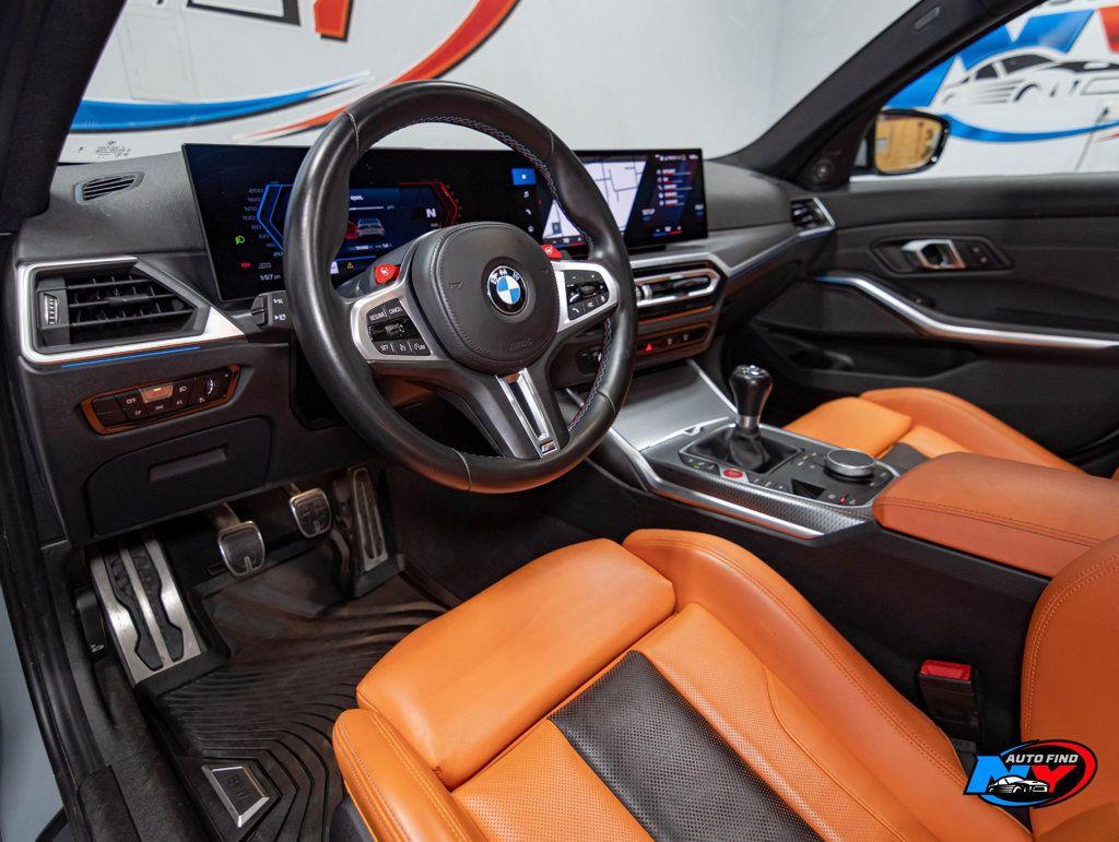 Take a look at this Brooklyn Grey Metallic 2024 BMW M3 Sedan with Kyalami Orange/Black Leather Interior, a Clean Carfax, only One Owner and only 18,086 miles. This car is for people who like the best of the best and accept nothing less. This car is simply breathtaking both inside and out. It also has a super clean history with only one previous owner. As if that wasn't already impressive enough, this car also has super low mileage and a ton of great optional features. It is an amazing machine that was treated with the utmost care by its one and only previous owner. It is a car for the record books so do not hesitate to call us now. It comes equipped with a 3.0L Straight 6-cylinder Engine paired to a 6-speed Manual Transmission, Sunroof, Navigation, Backup Camera, Blind Spot Detection, Lane Departure Warning, Lumbar Support, Apple CarPlay and Android Auto Compatibility, Navigation System (with Voice Activation), Parking Assistance Package (with Parking Assistant Plus), Sport Leather Steering Wheel, M Compound Brakes with Black Calipers, Merino Leather Upholstery, Heated Front Seats, M Sport Seats, Enhanced Bluetooth Wireless Phone Connectivity, Harman Kardon Surround Sound System, 16 Speakers, Wireless Device Charging, Cruise Control, Steering Wheel Controls, AM/FM Radio, Power Windows, Power Locks, Air Conditioning and so much more. Every NY Auto Find vehicle comes with a complimentary Limited Warranty and a Carfax Vehicle Report. Our vehicles are priced to sell quickly. Please call to check availability and schedule an appointment. -