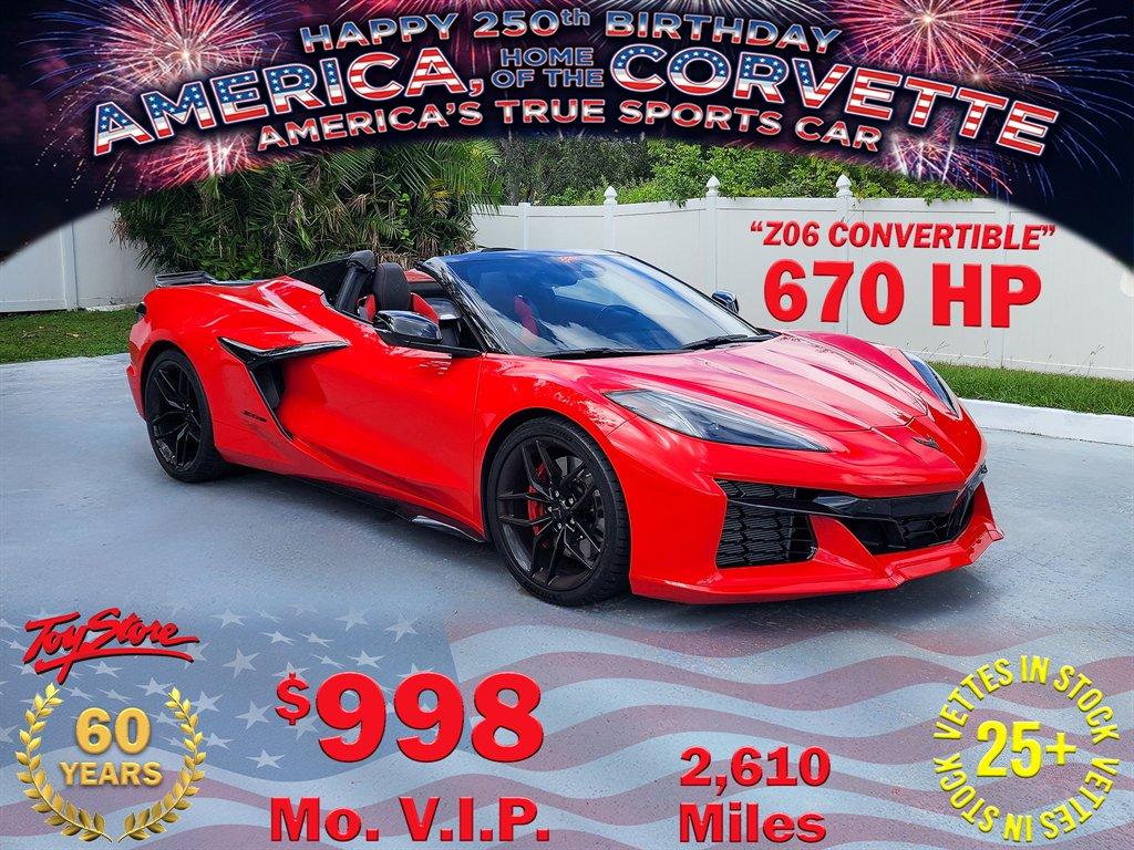 CORVETTE 2025 Z06 CONVERTIBLE, Torch Red with Adrenaline Red Leather Interior, 3LZ Equipment Package, 8-Speed Dual Clutch Transmission, Bose Performance Series 14 Speaker Audio System, Sirius Radio, OnStar, Performance Data and Video Recorder, Universal Home Remote, Head Up Display, Dual Zone Air Conditioning, Heated and Ventilated Seats, Rear Camera Mirror, Memory package, Dual Power GT2 Bucket Seats, Power Retractable Hard Top with Remote Activation, Rear Spoiler, Composite Splitter and Rockers, Front Lift Adjustable Height Memory, 10-Spoke Black Forged Aluminum Wheels, Red Painted Calipers, Stealth Interior Trim Package, 2-Tone Seats, Black Exhaust Tips, 5.5 Liter Flat Plane Crank V8 Producing 670 H.P. and 460 lb-ft of Torque. OUR OWNER'S PERSONAL DRIVER - 2026 ON THE WAY! This stunning 1-owner Z06 Convertible has only 3k miles and qualifies for our exclusive V.I.P. financing plan. Compare at $149,000 - WHOLESALE $125,850 / $998 mo. V.I.P. w/33% down cash or trade plus tax, tag, and fees. Call for additional details. Toy Store, Largo, Fl. 727-585-6000 www.vettenet.com Open 6 days, Sunday by appointment. WE BUY CLEAN CORVETTES!!! Shipping assistance available to 48 states for only $689.00. SELLING QUALITY LOW MILEAGE CORVETTES FOR 60 YEARS! EXPECT TO BE IMPRESSED PERFORMANCE SPOKEN HERE